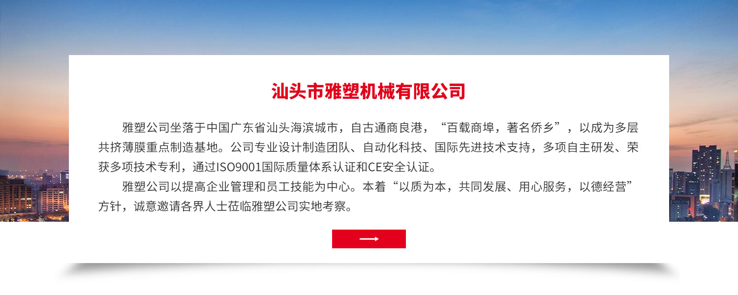 •   雅塑公司坐落于中國(guó)廣東省汕頭海濱城市,自古通商良港,“百載商埠,著名僑鄉(xiāng)”,以成為多層共擠薄膜重點(diǎn)制造基地。